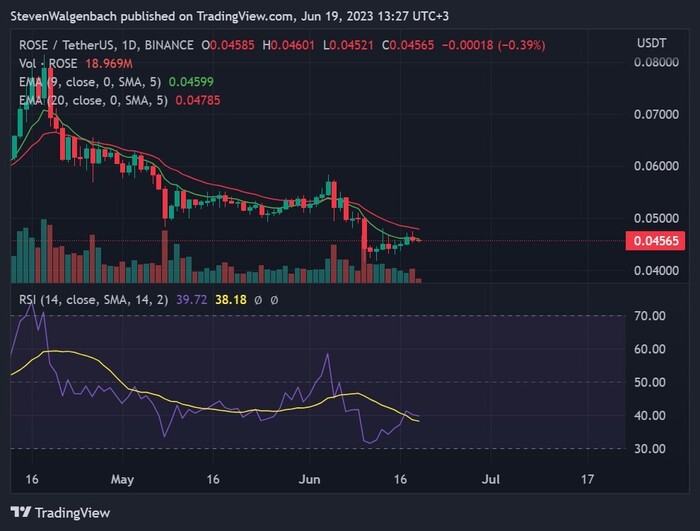 Как и остальная часть криптовалютного рынка ИИ, ROSE также зарегистрировал 24-часовой убыток. Сегодня альткоин торгуется по $ 0,04565 после снижения цены на 3,37%. Тем не менее, недельная производительность альткоина остаётся положительной на уровне +3,37%.