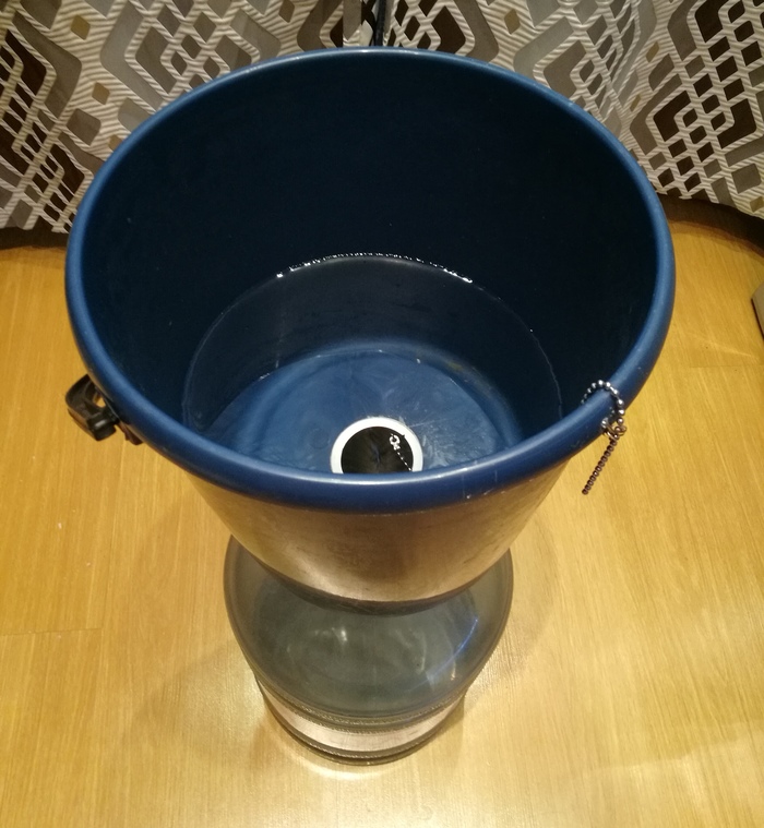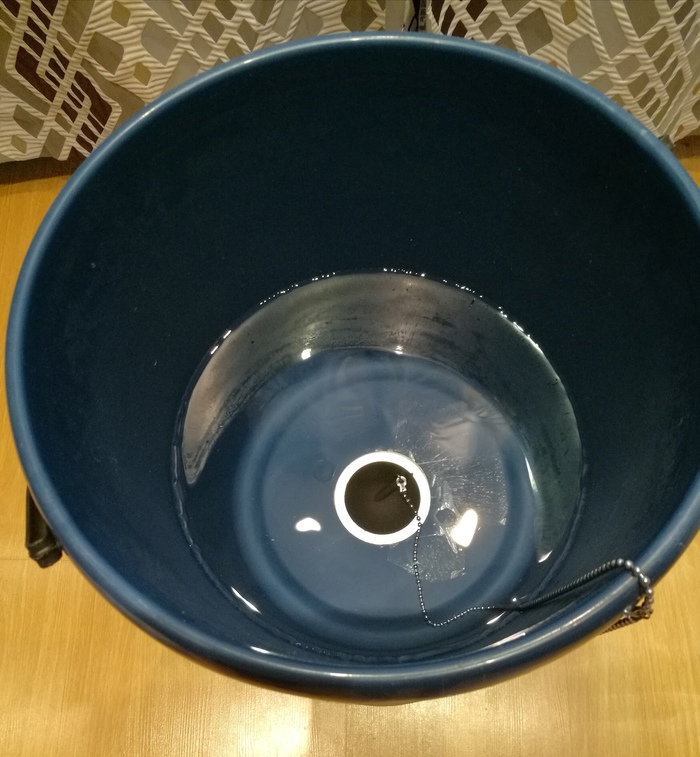Для изделия нам потребуются ведро пластмассовое (литраж выбирайте сами), сифон простой (слив-перелив для ванны, с пробкой - желательно резиновой), клей (который, может клеить пластмассу), нож. Берем ведро, проделываем по центру отверстие или дыру (кому как хочется) на дне ведра под диаметр сифона (здесь может быть использован любой доступный способ, я брал нож и аккуратно вырезал, ОСТОРОЖНО, дно ведра может треснуть и берегите руки). Далее вставляем сифон в ведро, проклеиваем прокладки сифона с ведром и закручиваем винт сифона, пробку с цепочкой присоединяем к ведру. Все готово. Проверяем герметичность. Получилось ведро-воронка, ну или воронка-ведро. Фото как это выглядит ниже. Предложение на усовершенствование принимается. Спасибо за внимание.