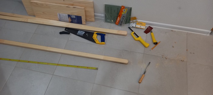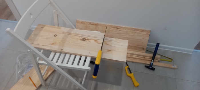 В то время мы часто посещали один известный зеленый строительный магазин, и как-то в голову сама пришла мысль, а не посмотреть ли там пиломатериалы, в итоге были найдены все необходимые комплектующие: рейки, доски, крепежи. Плюс там нам подрезали доски по ширине, так как мы хотели, чтобы передние ножки стеллажа были под углом, следовательно ширина полок уменьшалась от нижней к верхней.