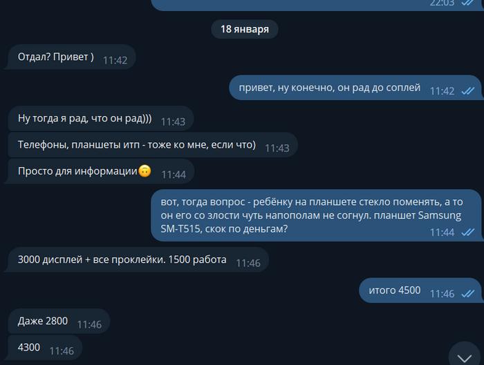 Ну и ещё раз, и потом сказал, что в принципе может помочь с ремонтом планшетов, телефонов и тп. А у меня как раз у ребёнка планшет сломан (стекло заменить надо), ну я и поинтереовался, сможет или нет. И, к счастью, ответил утвердительно.