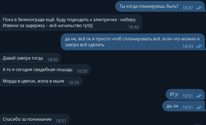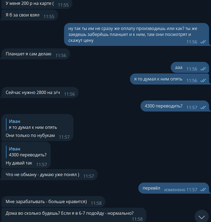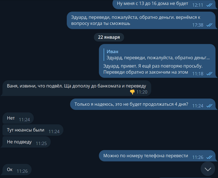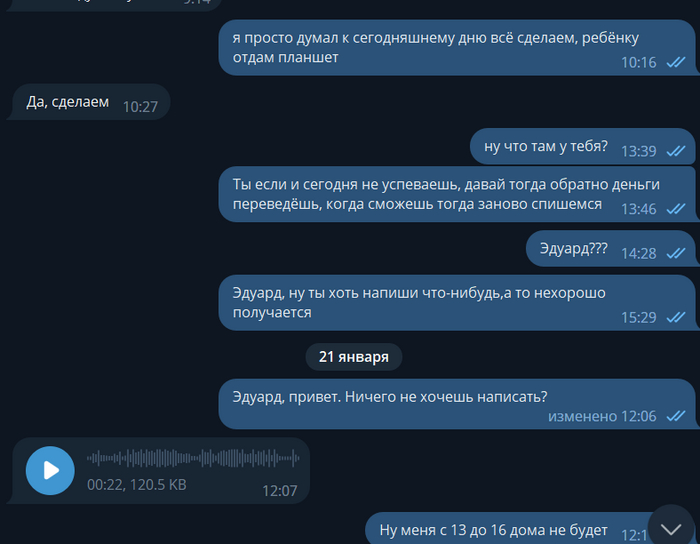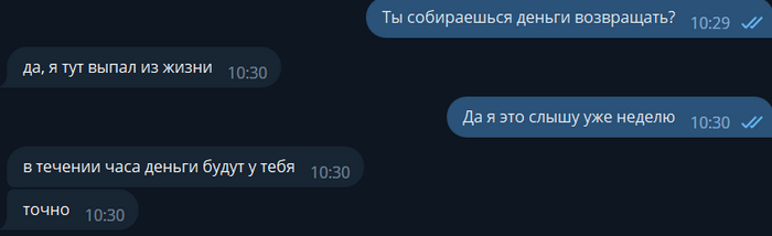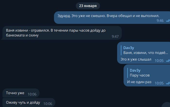 P.S. Если кому интересно помочь, можете этому индивиду в ТГ написать когда он деньги собирается возвращать, может, виртуальная сила Пикабу возымеет силу. Ник его https://t.me/Dav3y