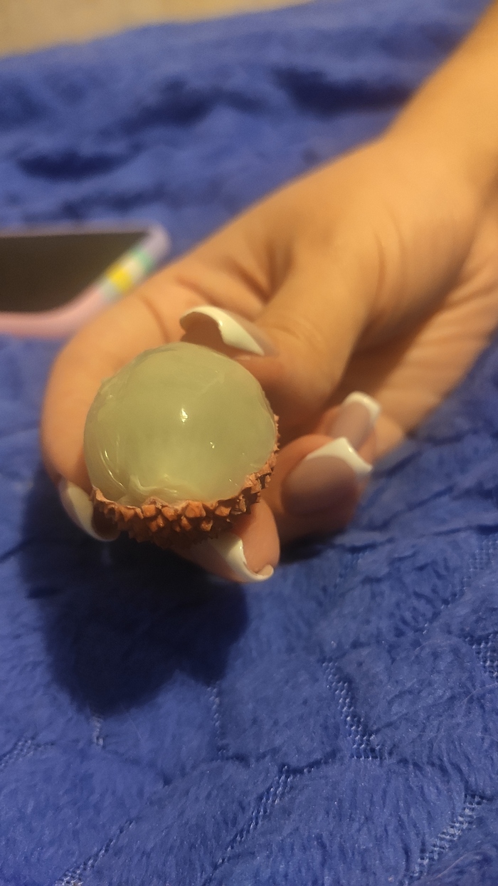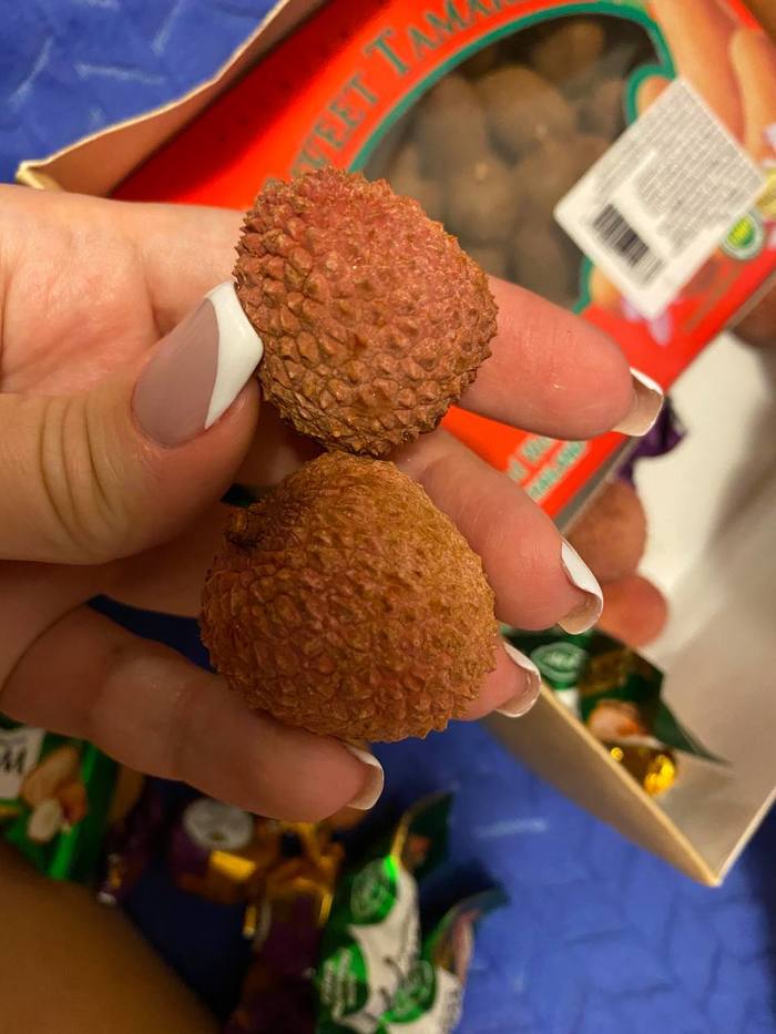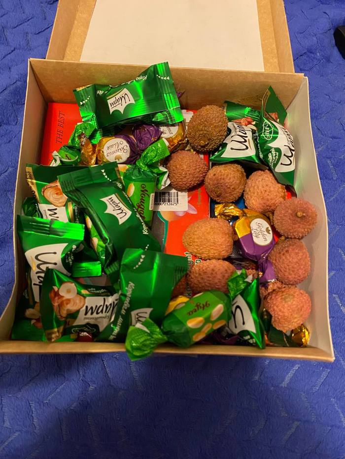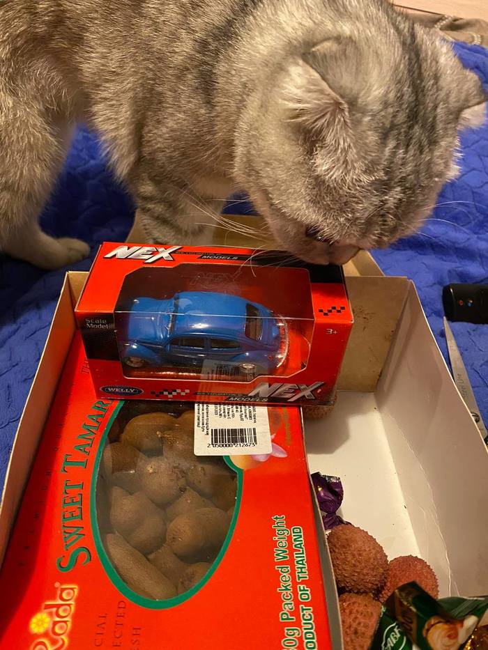 Убрав конфеты мы с супругой обнаружили Личи и ранее неизвестный фрукт, кошка тоже пришла на распаковку