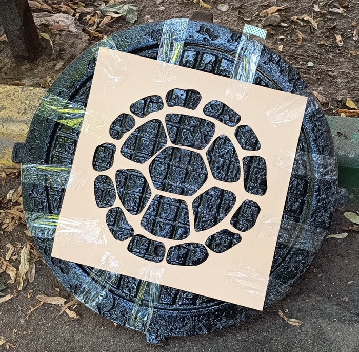 Четвёртое художество опять у моего подъезда. В детстве, как и миллионы мальчишек, я любил Черепашек-ниндзя. Всегда мне нравилcя их логотип на канализационном люке, а у моего подъезда как раз имеется такой. Ходил я вокруг него, ходил и решил оформить. Сначала очистил люк от скверны всякой, ржавчины там да грязи, выкрасил в чёрный цвет а потом в 3 этапа через трафареты нанёс логотип.