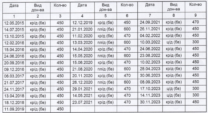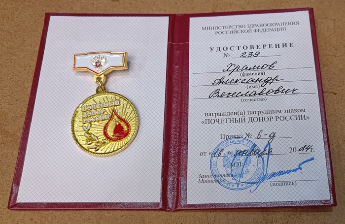 К началу 2023 мне оставалось ровно 7 кроводач до почётного и я решил что нужно в этот год всё закончить. Сдал сначала 4 чистых, потом 2 тромбоцитов и шлифанул всё 30 ноября последней чистой. Сразу же заполнил нужную бумагу, мол отдал кровь родине, выдайте уже значок! Сказали что ждать месяца 4, но по факту, получил через два.
