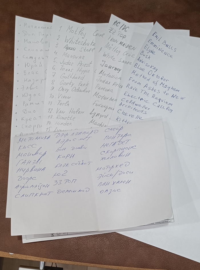 Первым делом я опросил дюжину (12) человек, с просьбой написать 20+ групп и исполнителей, которые они хотели бы видеть на данном столе. Кого-то опрашивал вживую, кого-то онлайн, с кем-то даже устаивали мозговые штурмы.