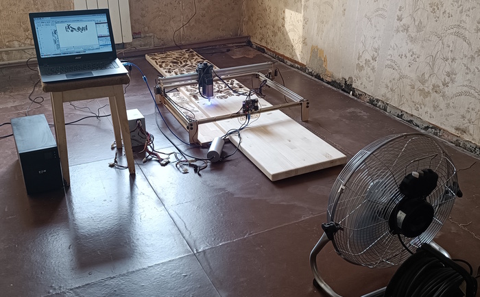 Мне понадобились: ноутбук для вывода задания на лазер, источник бесперебойного питания, чтоб скачок напряжения и/или отключения электричества на загубили заготовку, сам лазерный станок, компрессор для подачу в зону выжигания воздуха для лучшего горения, блок питания от компьютера, для запитывания лазера и компрессора и напольный вентилятор, чтоб выгонять продукты горения из комнаты через открытое окно.