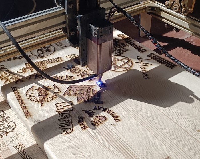 Дальше пошла работа поинтересней. Лазерная гравировка. На составление т.н. матрицы для гравирования я потратил около двух дней (фото было выше). Оказалось непростой задачей найти логотипы всех нужных групп, перевести их в вектор и разложить по поверхности.