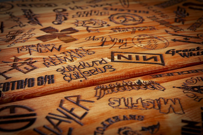 Набивалось за него по 8-10 человек, некоторым приходилось сидеть вторым рядом. Понятно было что делать нужно по крупному и делать мало-мало интересно, чтоб можно было обсудить что-то, когда темы для разговоров иссякли. Придумалось что можно награвировать на столешницу название всяческих рок групп. Благо в нашей компании худо-бедно, но рок слушают, кто больше, а кто меньше.