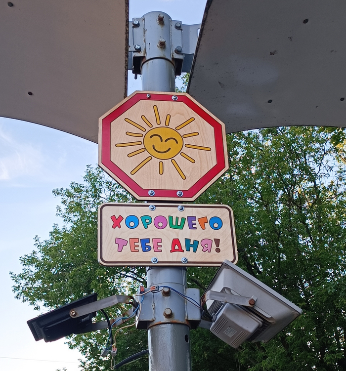 Со следующим знаком идея пришла быстро. Но я уже решил делать покрасивее, не просто гравировать, а ещё и раскрашивать. Текст родился сразу - "Хорошего тебе дня", а к нему и придумалась картинка - Солнышко. Выгравировал и раскрасил акрилом. Надеюсь никакого гейства тут народ не попытается найти, в инсталляции использовано 17 различных цветов, а не 6, как известно где.