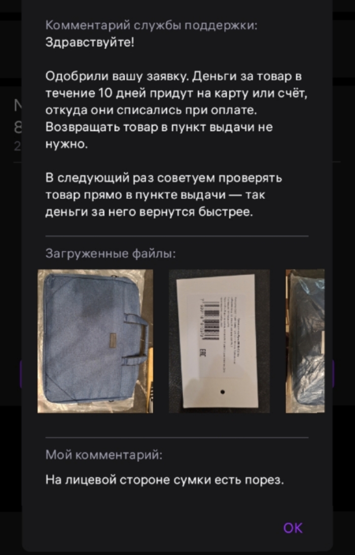 Заказала маме сумку для ноута. Пришла на ПВЗ, проверила мельком - молнии работают, и хорошо. Забрала, отвезла маме. На следующий день она мне её обратно приносит и показывает на брак, который я не заметила. Оказалось, что на лицевой стороне сумки есть небольшой разрез по ткани. Видимо, кто-то неудачно вскрыл ножом упаковку. Я захожу в раздел возврата по браку и вижу, что вернуть сумку можно только в день получения заказа. Без особой надежды все-таки описываю ситуацию, прикрепляю фото... И спустя пару дней мне возвращаются средства. И продавец пишет, что не нужно возвращать товар обратно!