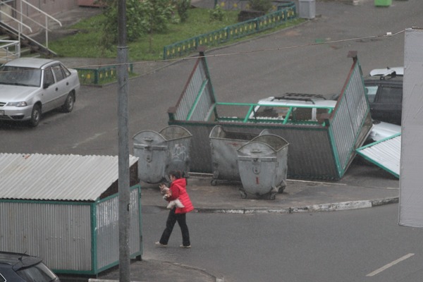 Только что был свидетелем, как ветром сорвало крышу с какого-то здания, типа склада. Также перевернуло навес над мусорными баками, чуть не вырвало фонарный столб. Видел пролетевшую мимо окна занавеску, пакеты и нечто похожее на полотенце.