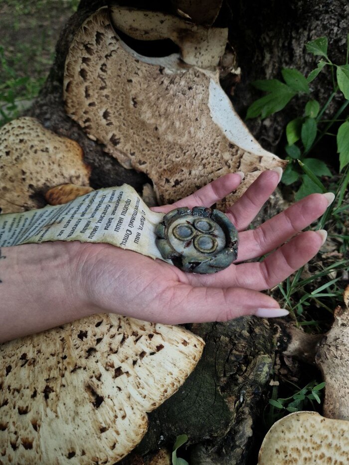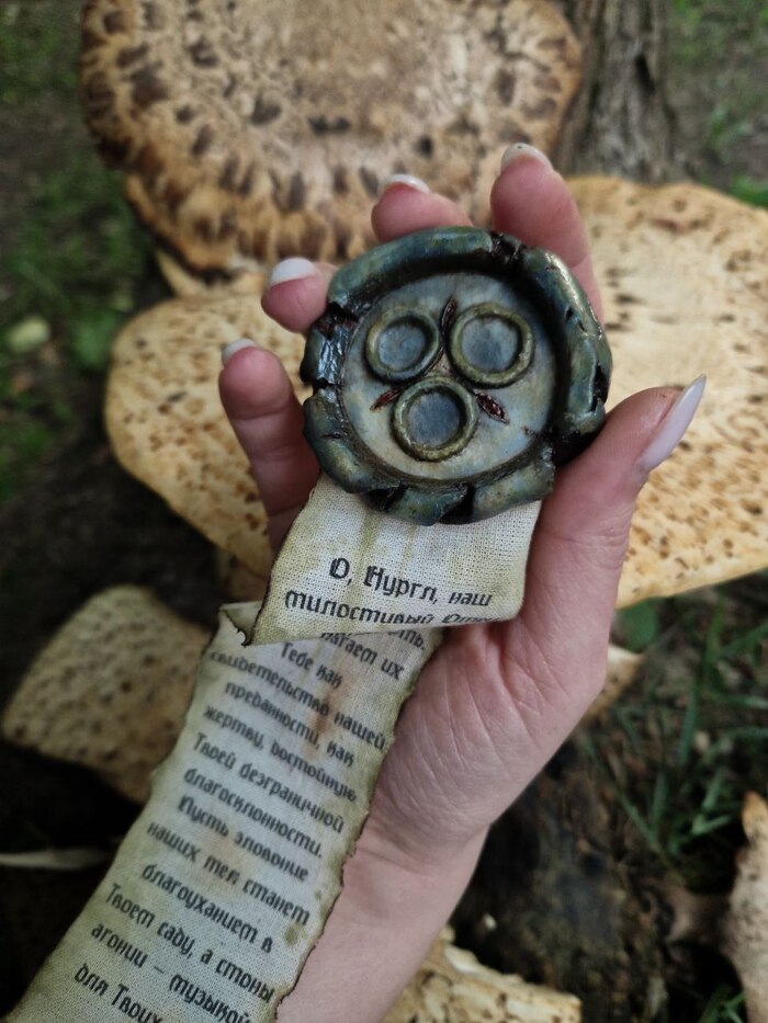 Некогда печать чистоты благородного воина адептус астартес была осквернена говной нургла, превратилась в шмат гнилой органики и срослась с силовой пижамой. А потом отвалилась и пошла за пивом. Ладно, если серьёзно, то давно хотелось нурглячью печать "чистоты". Ересь та ещё, но небольшую хотелку реализовал и доволен. Заодно и дама приобщилась к вахе и процессу создания.))