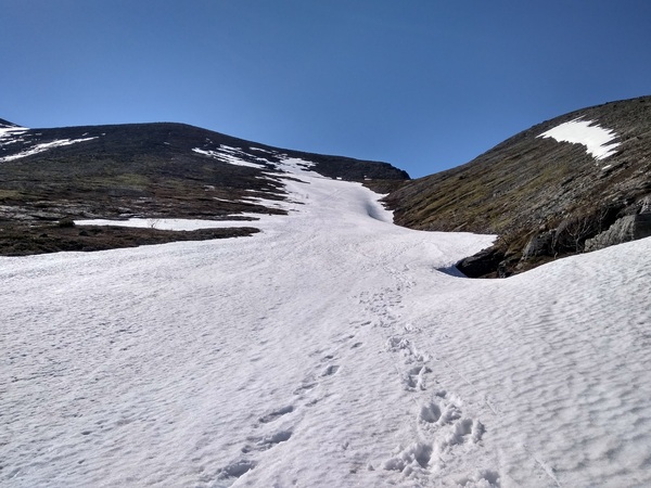 Мы спустились в небольшое ущелье, чтобы выйти по нему до ущ. Аку-Аку, в ущелье было много снега. Сначала мне даже понравилось по нему идти, это было определённо приятнее чем идти по мху или курумнику, но, ровно до того момента как я одной ногой провалился ниже колена под него. Снег больше не казался таких хорошим, учитывая что под ним было много камней с достаточно острыми углами.