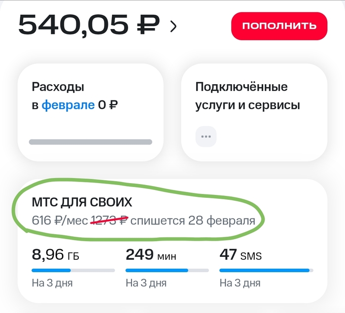 Я зашла в приложение МТС, что бы убедиться, что автоплатеж поступил корректно, суммы на счёте хватает и вообще успокоить свою тревожность. И наблюдаю там информацию, что 28 февраля спишется 616 рублей: