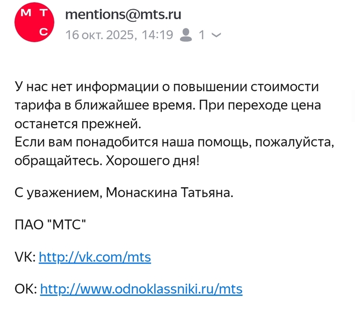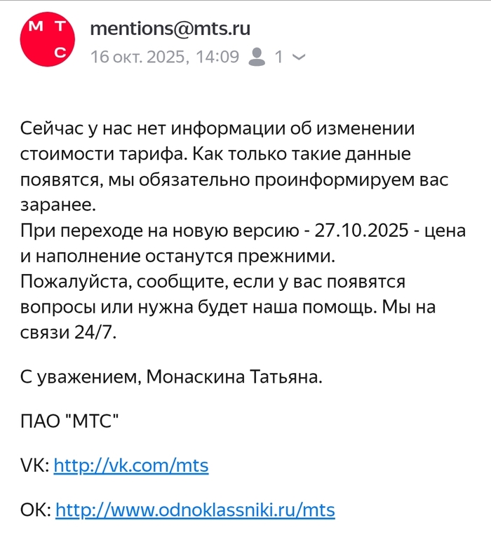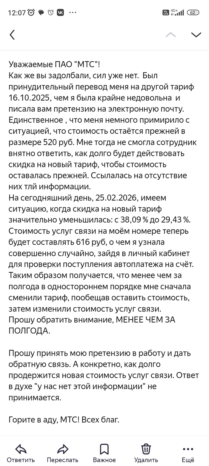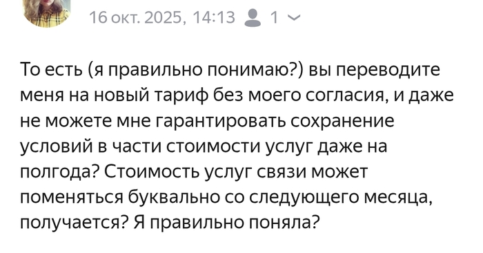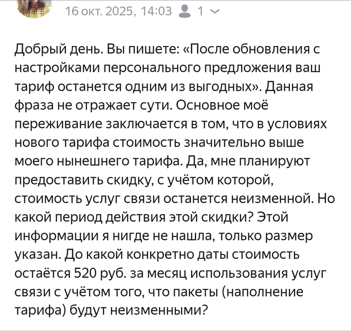 Предыстория будет короткой, не буду пересказывать все повышения стоимости, хотя за короткое время связь у меня стала дороже почти в 2 раза за несколько скачков повышений. Последняя история моей проигранной битвы с МТС была 16.10.2025 года, когда она в одностороннем порядке сменили мне тариф. Я узнавала, так, к сожалению можно. Договор на услуги связи составлен таким образом, что оператору вообще много чего там можно делать, главно, не забыть предупредить абонента в установленный срок. Надо отдать им должное, сменив тариф, они оставили мне стоимость прежней, хотя и с оговоркой, что предоставляется скидка на новый тариф в достаточном размере, чтобы сохранить стоимость 520 руб. (да, связь у меня стоила 520 рублей, меня это устраивало, я мало говорю по телефону, смс почти не пишу, интернета 20гб с головой хватает на месяц).