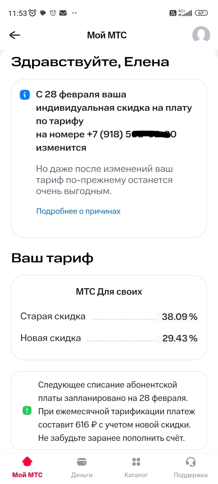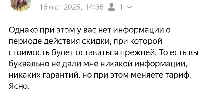 В связи с тем, что я была крайне недовольна изменениям, писала им в поддержку, что было не так уж просто, через робота в приложении пробиться нереально, еле как нашла форму подачи претензии на полной версии из сайта (в мобильной её не было). Сотрудник Монаскина Татьяна так и не смогла мне дать ответ, как долго будет действовать эта скидка, чтобы не было повышения стоимости на новом тарифе. Прикладываю скрины моей переписки: