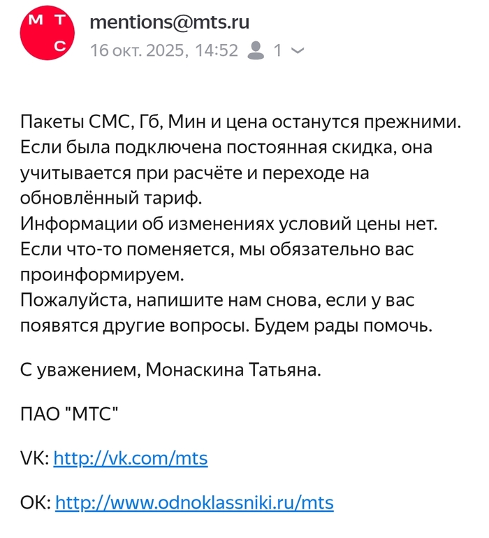 Ответ получен не был, но через пару дней уровень ненависти к МТС немного снизился, я решила, что раз стоимость и правда осталась прежней, пусть будет этот тариф. Хотя меня очень сильно напрягло отсутствие сроков действия этой скидки.