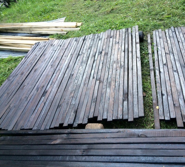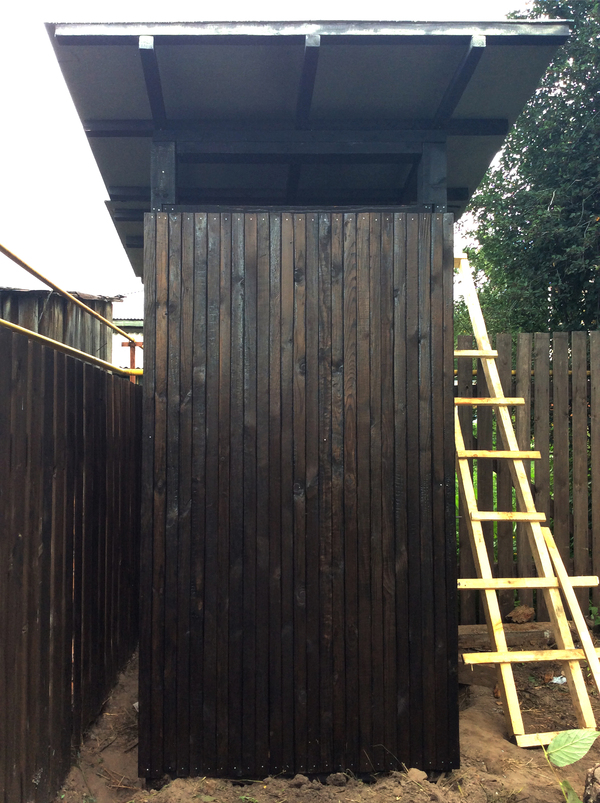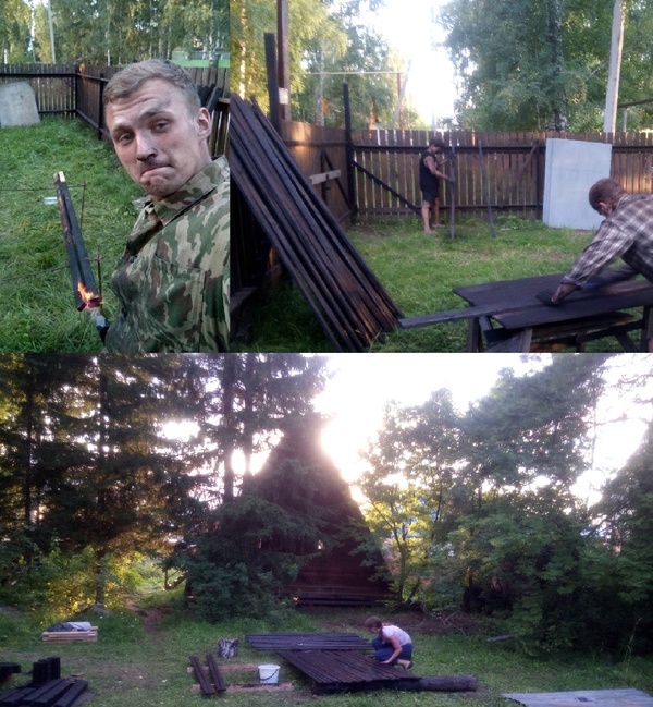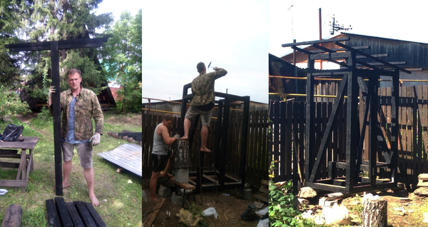 Хотел сначала каркас тоже обжечь, но побоялся, что из-за того, что он собран из досок, могут возникнуть проблемы с конструктивной целостностью элементов. Прокрасили с братом пропиткой и собрали, полностью соблюдая технику безопасности.