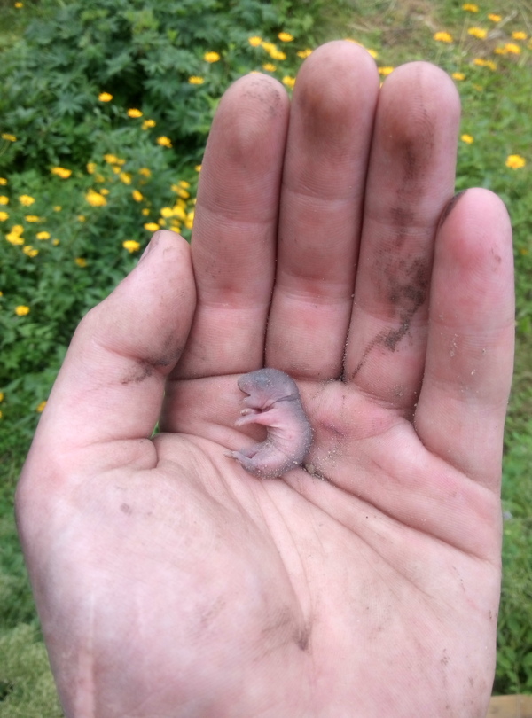 Под старым туалетом где-то было мышиное гнездо, нашёл новорождённого мыша, который откуда-то оттуда видимо выпал в процессе реконструкции фундаментов. Он был очень бодрый, дрыгался и вертелся, положил откуда взял, чуть позже он был найден своей мышиной матерью.