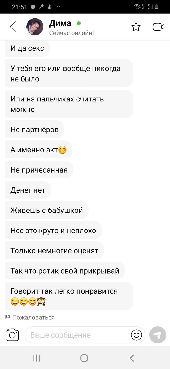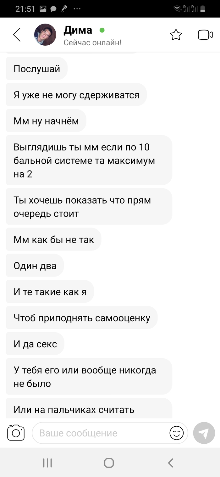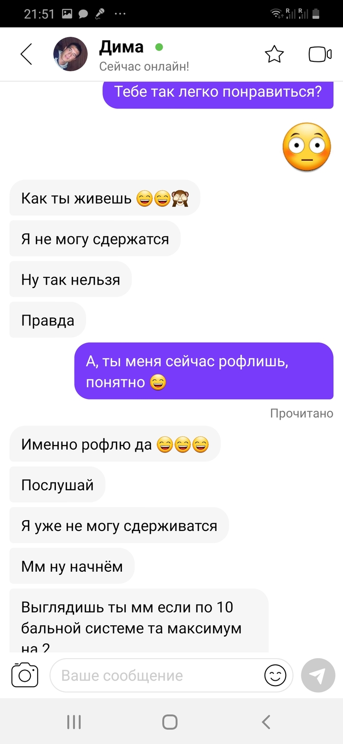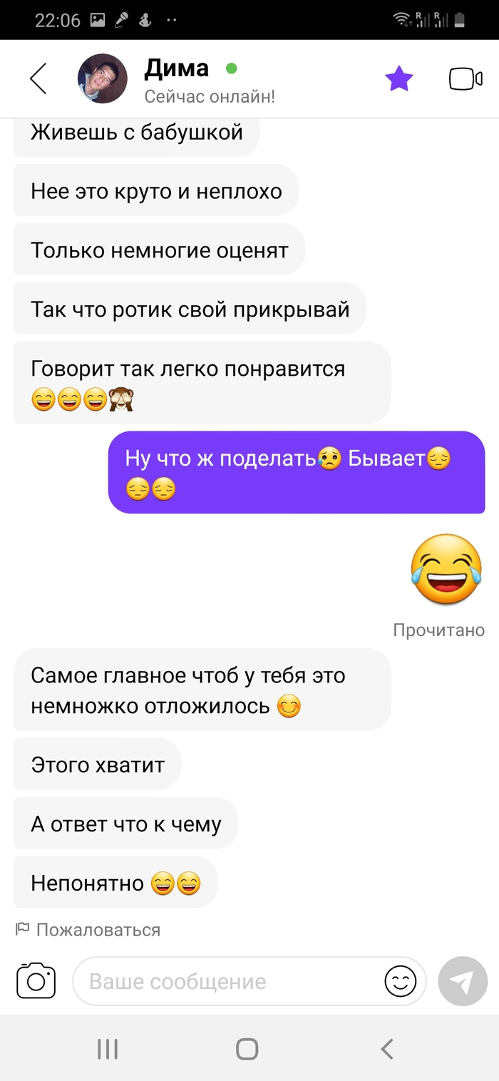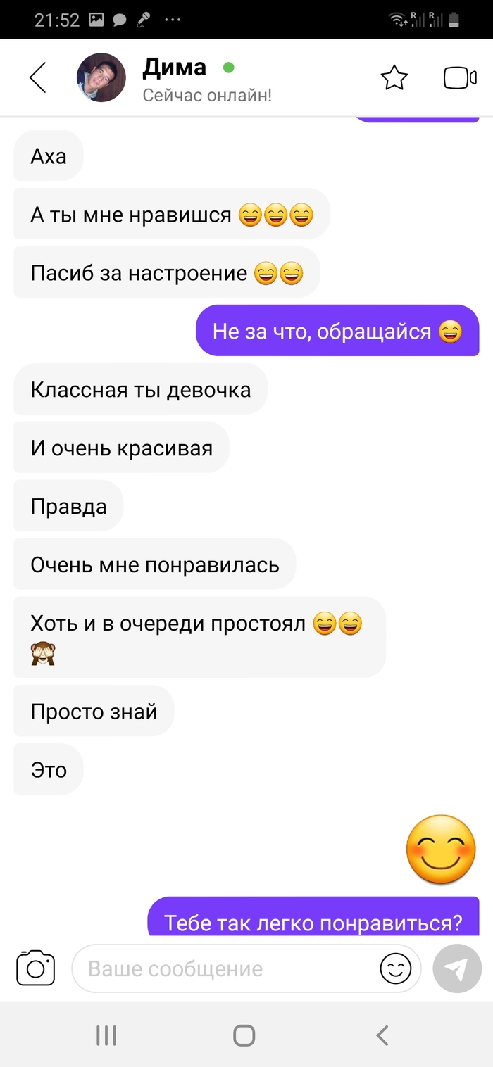 Зарегалась я недавно на Баду. Опыт был уже, алгоритм действий, в принципе, понятен. Просматриваешь все "приветы", отклоняешь абсолютно неподходящих, всем остальным отвечаешь взаимным "привет" и смотришь, как пойдет. Кстати, разумно прежде договора о встрече хотя бы раз созвониться и получить представление о человеке: есть ли вам о чем поговорить, легко ли с ним общаться и т.п. Многое становится понятным на этапе созвона, это сильно экономит время. И нервы) Так вот... Неделю назад разместила фотку на сайте. Все норм, переписываюсь с парой человек и тут...