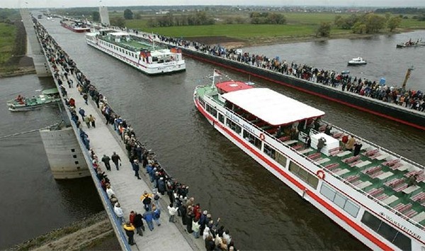 Магдебургский водный мост, расположенный в Германии, позволяет кораблям проплывать над рекой Эльбой.