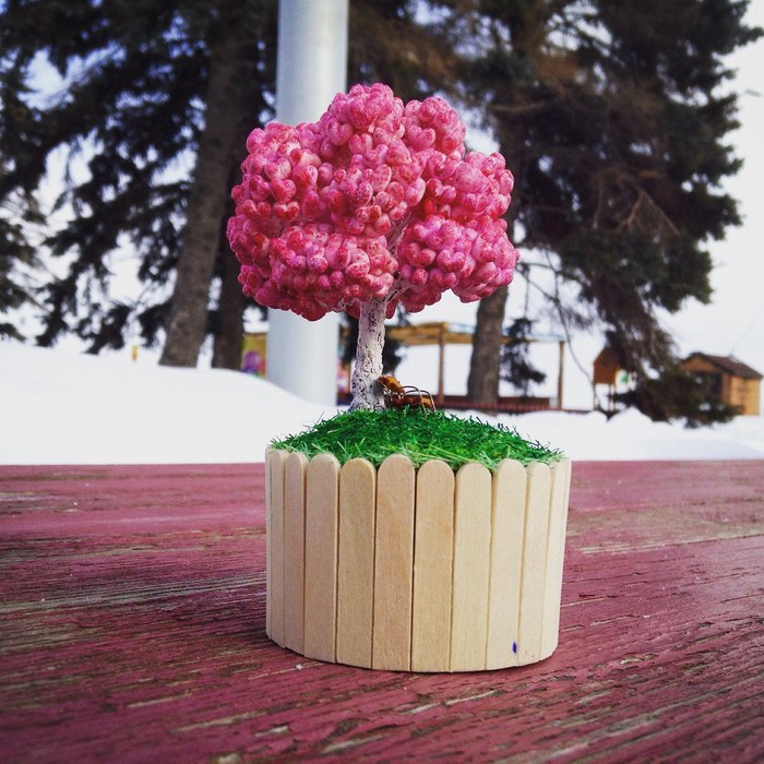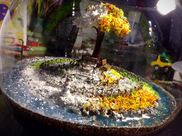 Лёд Я делала первый раз, возможно, есть способы и получше. Я дождалась, пока эпоксид застынет и залила зимнюю часть реки клеем из клеевого пистолета, распределяя его маленькой ложкой. Сверху распылила искусственный снег и покрыла всё акриловым лаком.