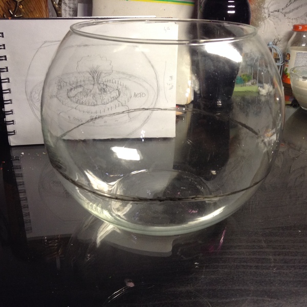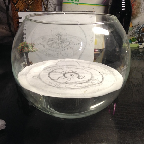 Для начала нам нужна сама ваза. Я использовала трёхлитровую (16 см в высоту, 18 см в диаметре). Рисуем небольшой эскиз для неё, чтобы в будущем можно было по нему ориентироваться (эскиз на заднем плане).