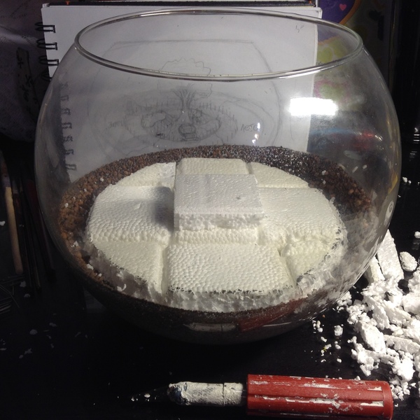 Прорезаем по краям "ров" для реки, а в центре приклеиваем небольшой кусочек пенопласта, который послужит основой для холма, на котором будет стоять дерево.