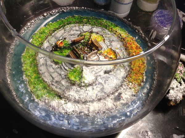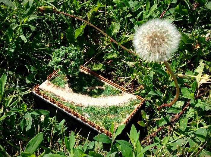 После этого берём цветочный мох или другой материал имитирующий траву, и обклеиваем им берега и лужайки, предварительно смазанные латексным клеем.