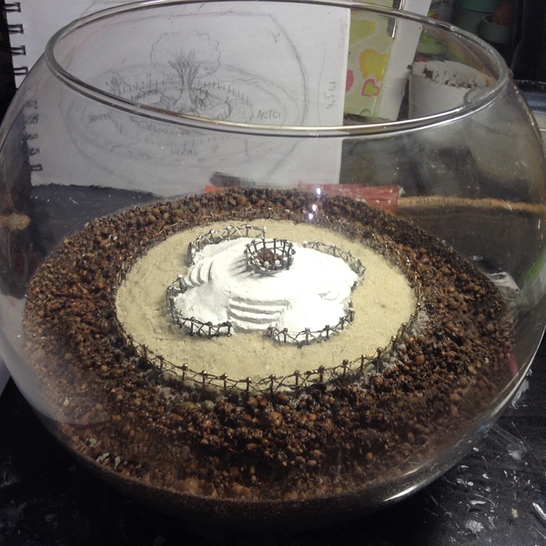 Смешиваем дренаж с небольшим количеством пва и этой массой облепливаем пенопласт, создавая основу для ландшафта. Пока масса не застыла, втыкаем в неё заборчики.