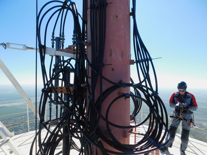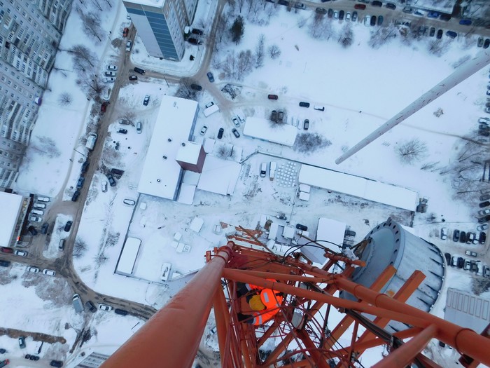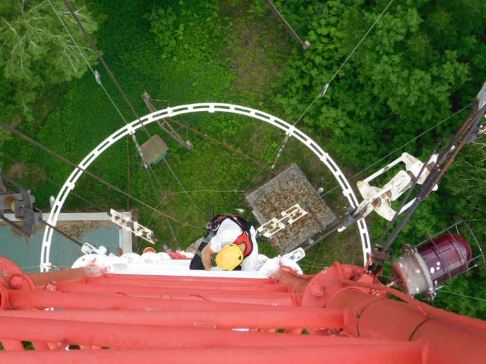 Снова Казань. Радио-мачта 150 м. Треть подъёма пролез снаружи ствола, потому что внутри был фидерный мост, который занимал все пространство.
