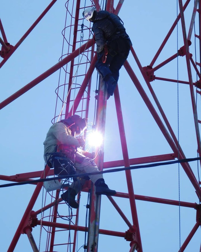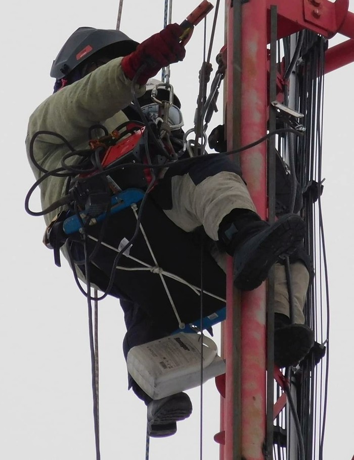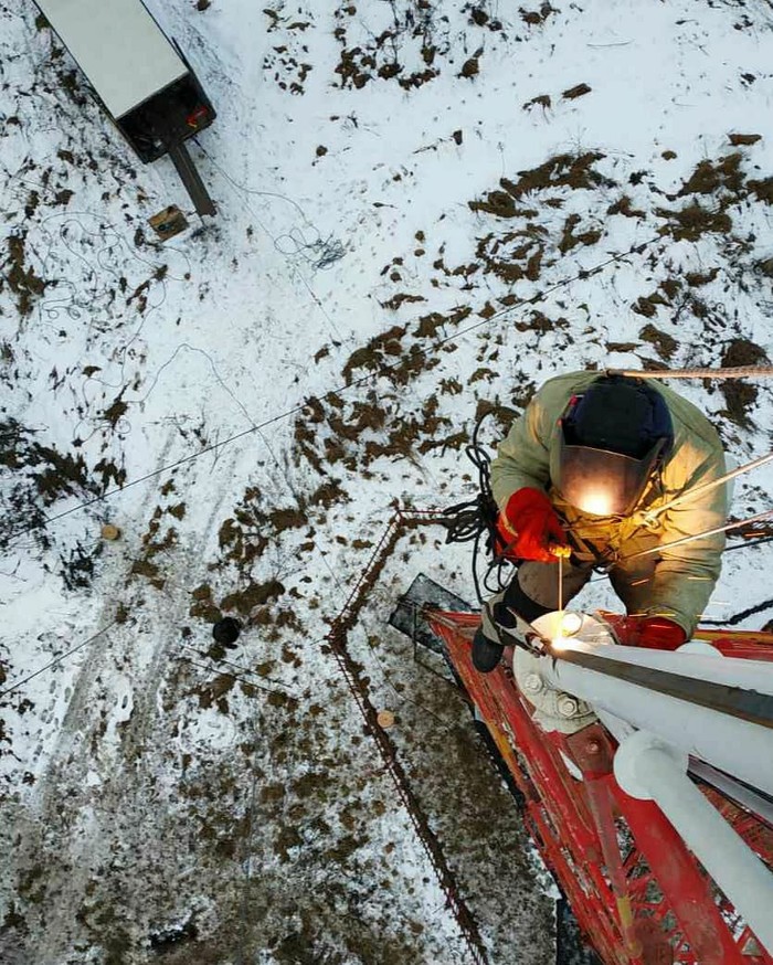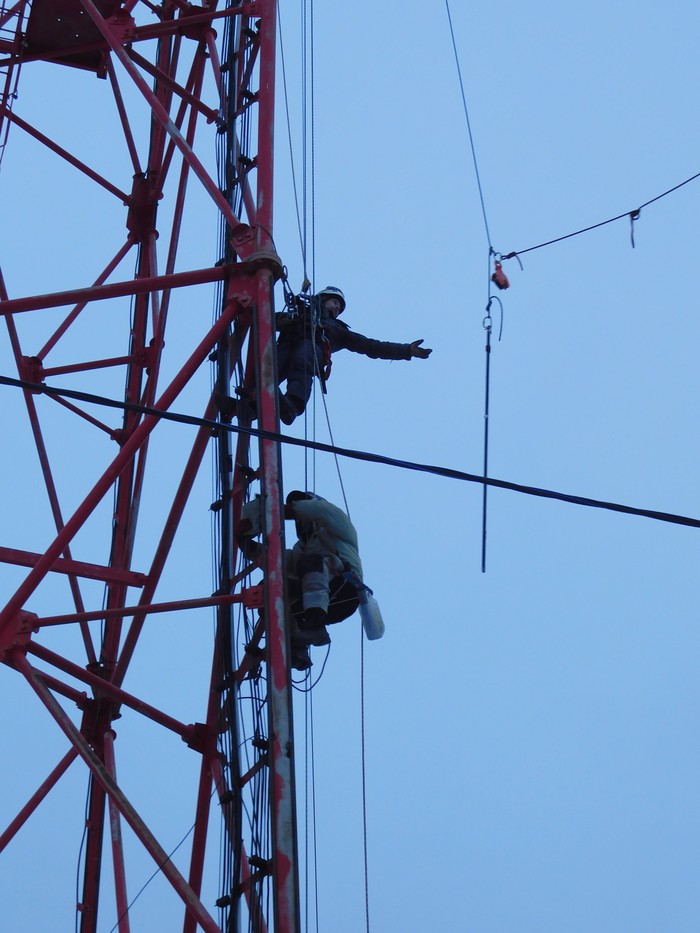 Сделать всю работу по стволу мачты за 1 день мы не успевали, и знали это заранее, потому что уже бывали на таком же объекте. Поэтому просто намеревались сделать сколько успеем до захода солнца. Сделали 250 метров, остались нижние 100.