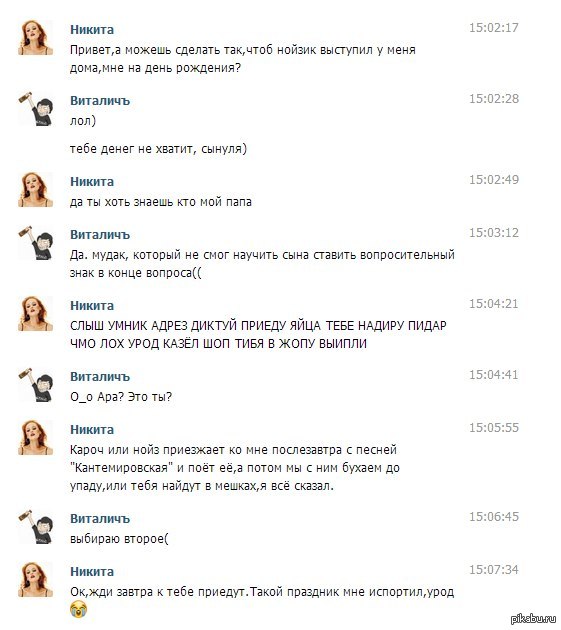 13 Hillz 11 лет назад Нойз такой Иван Переписка известного русского артиста с администратором его группы ВК. Было в сентябре 2013, так что ссылку уже не найду. [моё] Noize MC ВКонтакте Мат