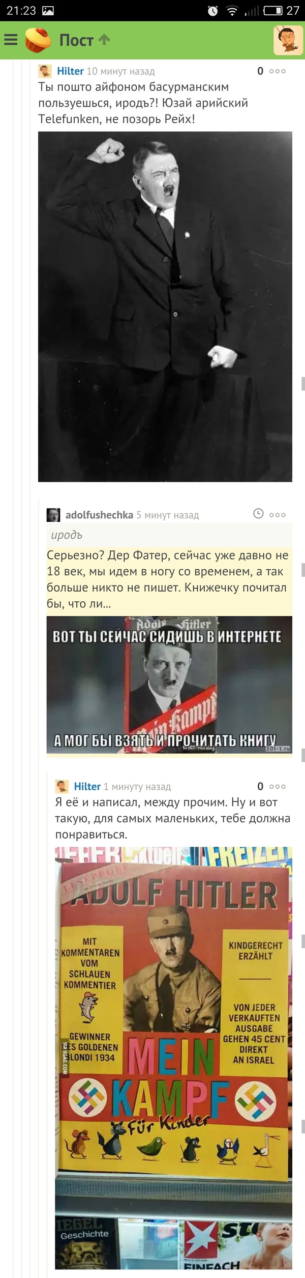 Hilter 9 лет назад Война не на жизнь, а на смерть! Или история о том, как два Гитлера в комментариях воевали: Продолжение следует! #comment_67664704 Показать полностью 2 [моё] Комментарии Пикабу Война Адольф Гитлер Длиннопост