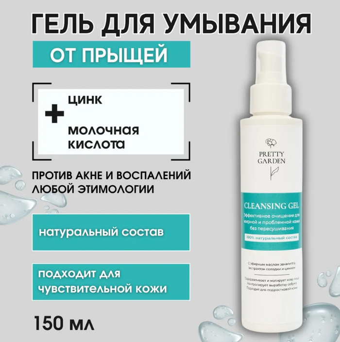 Pretty Garden Гель для умывания очищающий против прыщей себорегулирующий, 150мл: на мягких ПАВ растительного происхождения, с эфирными маслами чайного дерева и эвкалипта, экстрактами солодки, ромашки, розмарина и ментолом. Консистенция – прозрачный гель с хвойно-мятным ароматом. Прекрасно очищает, не пересушивая даже мой нормальный тип кожи. По составу – действительно гель для жирной и проблемной кожи, ментол оставляет свежесть и легкий холодок на лице, а эфирные масла дают антибактериальный эффект, замедляя рост патогенной микрофлоры, вызывающей акне. Подойдет взрослым и подросткам.
