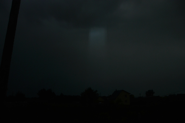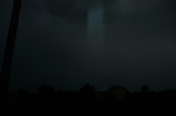 Дело было за городом, за окном была гроза и лил дождь. С целью снять молнию был установлен фотоаппарат (на DIY штативе из пуфиков), но заместо нее удалось снять что-то другое.