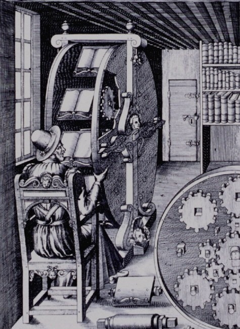 «Книжное колесо» изобрел итальянский инженер Агностино Рамелли (Agostino Ramelli), родившийся в 1531 году. Задача этого устройства в том, чтобы облегчить человеку работу сразу с несколькими книгами. На колесе располагались полки с открытыми на нужных страницах книгами, в нужный момент пользователь «докручивал» до себя нужный фолиант, делал выписку (копипастил) и продолжал работу.