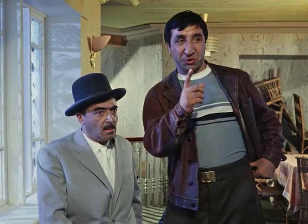 «Гайдай хотел, чтобы Саахов был гротесковым, пародийным, — рассказывал Этуш. — Я понимал его. Но не мог с этим согласиться. Важен в этом смысле был наш спор с Гайдаем по поводу сцены, когда Саахова, незадачливого жениха, героиня фильма Нина обливает вином. Гайдай предлагал в этом эпизоде максимум эксцентрики. Я же предложил серьезность. Ведь мой Саахов серьезен, он не понимает, как можно отвергать его ухаживания. Сцену отсняли, и единственной уступкой Гайдаю остался цветок за ухом, который, однако, лишь подчеркивал мою серьезность, и это — я был счастлив убедиться — дало нужный комический эффект…»
