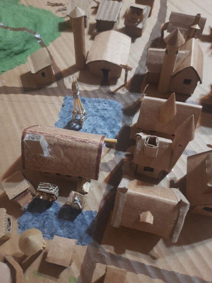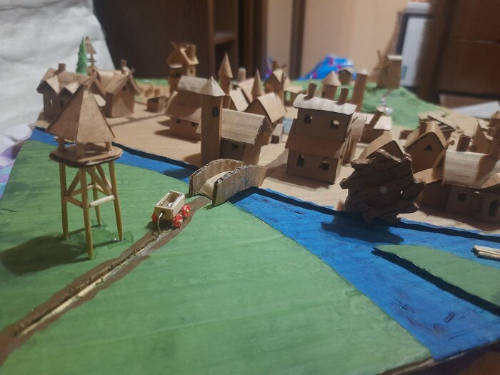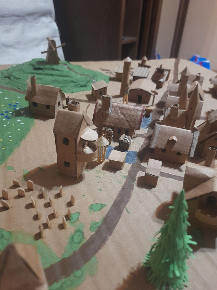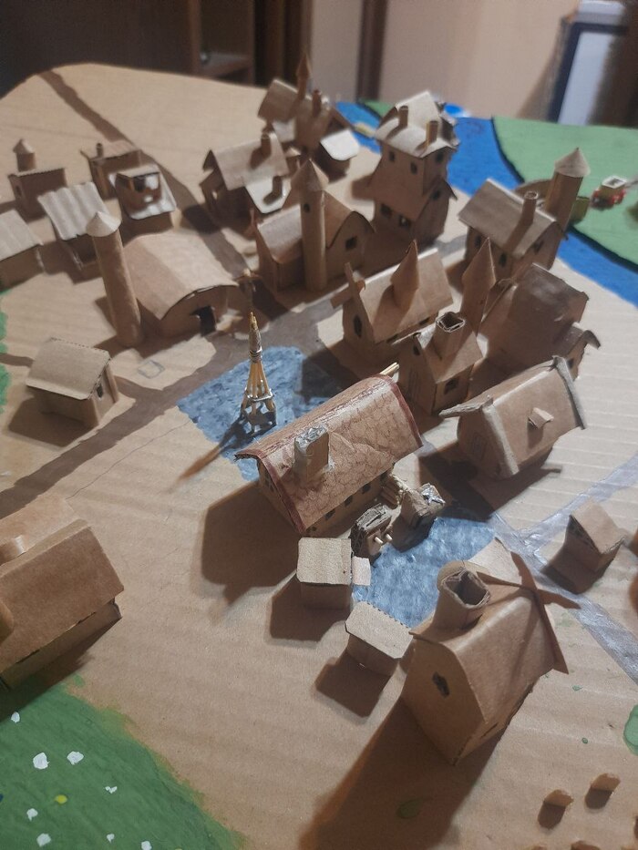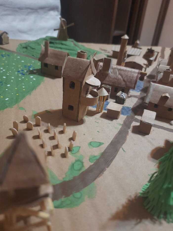 Мельницы и смотровые башни я сделал когда уже надоело делать однотипные домики) часть стен и крыш делали уже дети, я только добавлял украшения, вырезал окошки.. несколько недель, по вечерам.. домики добавляли за победу в приключениях, это была одна из наград для героев.. Супруга акрилом раскрасила главную и рыночную площади, а дети гуашью остальное) цветочки добавила дочь, захотелось ей луг)
