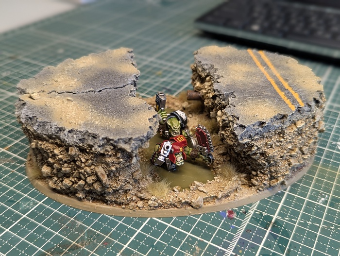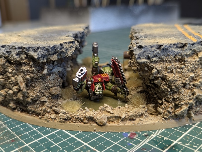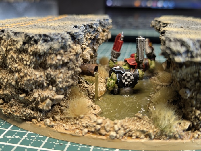 А тут мне подвернулась большая база для орочьего Горканавта-Морканавта. И мне в голову пришла вот такая дурка (ниже на фото). Морканавт у меня будет гоффский, но Великому Ваагху Гази кланы не помеха, поэтому в жиже бредут как гофф, так и парняга из Evil Sunz.