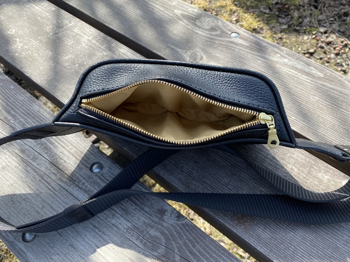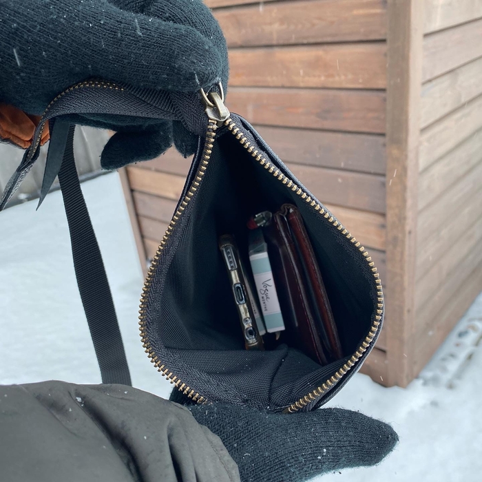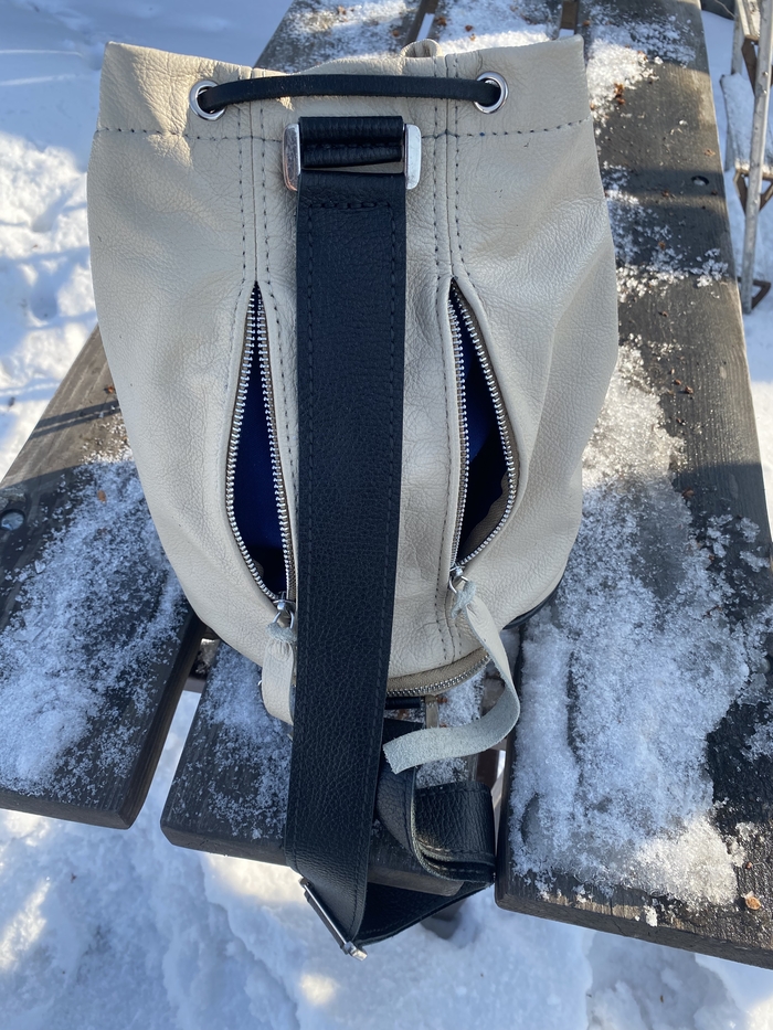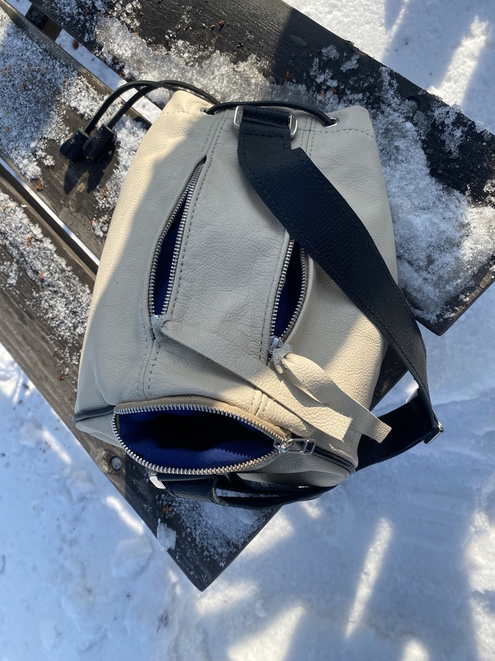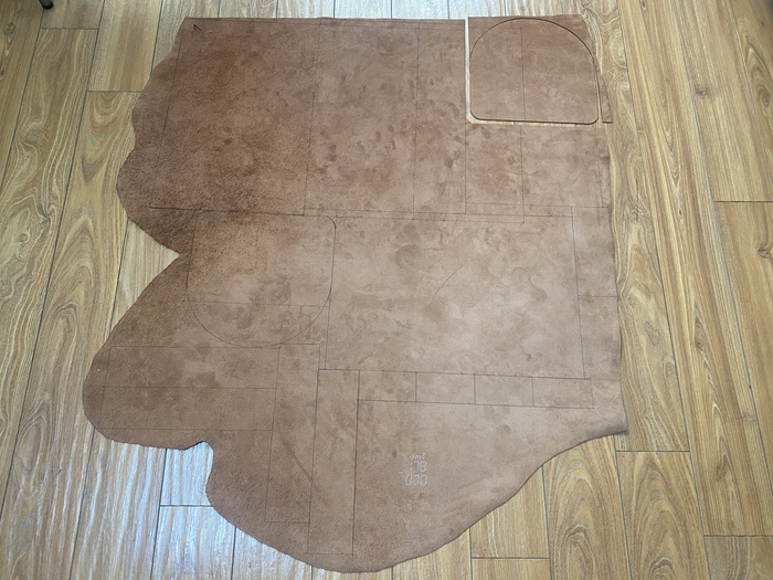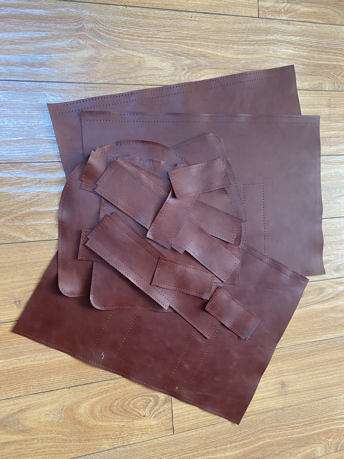 Основная задача была сделать из того, что есть, с минимальными дополнительными тратами. А это последний кусок кожи от дивана, пошёл на основу. Ремень из новенькой шкуры. Молнии и бегунки YKK. Подкладка из какого-то плотного и тактильно приятного материала. Фурнитура ремня от старой сумки Dr. Koffer. Докупал только люверсы.