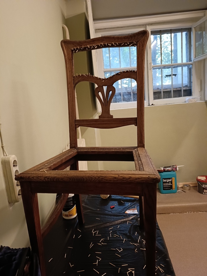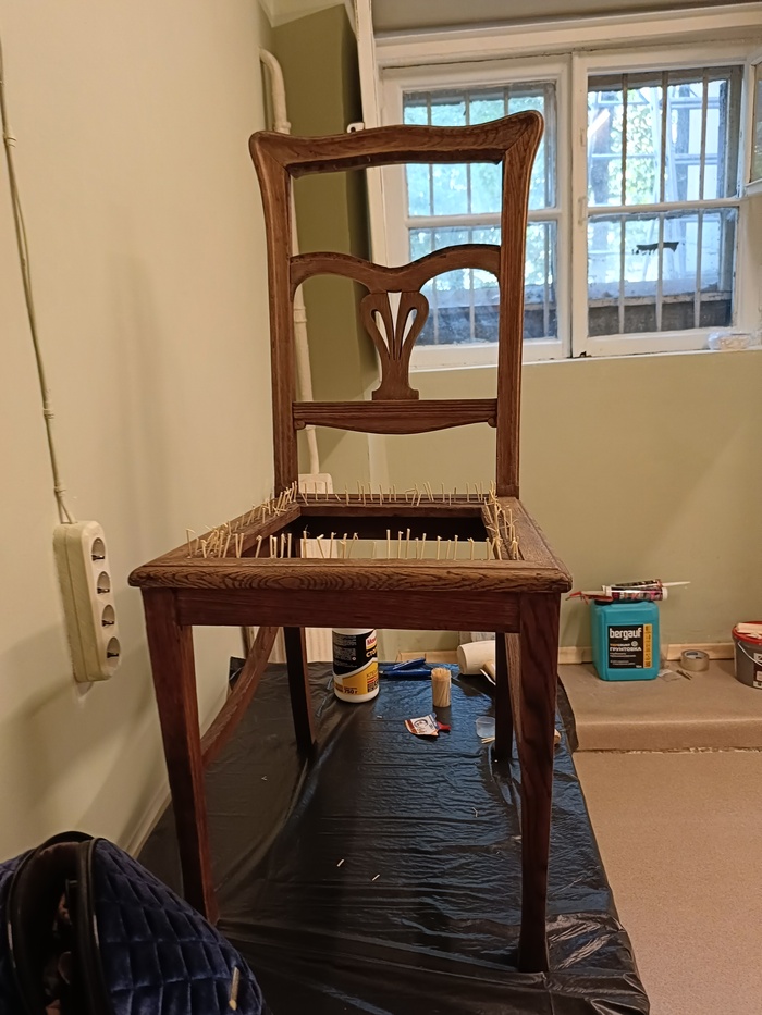 На следующей неделе в планах доснять старое покрытие и подобрать тон морилки, что бы вытянуть стул в один цвет