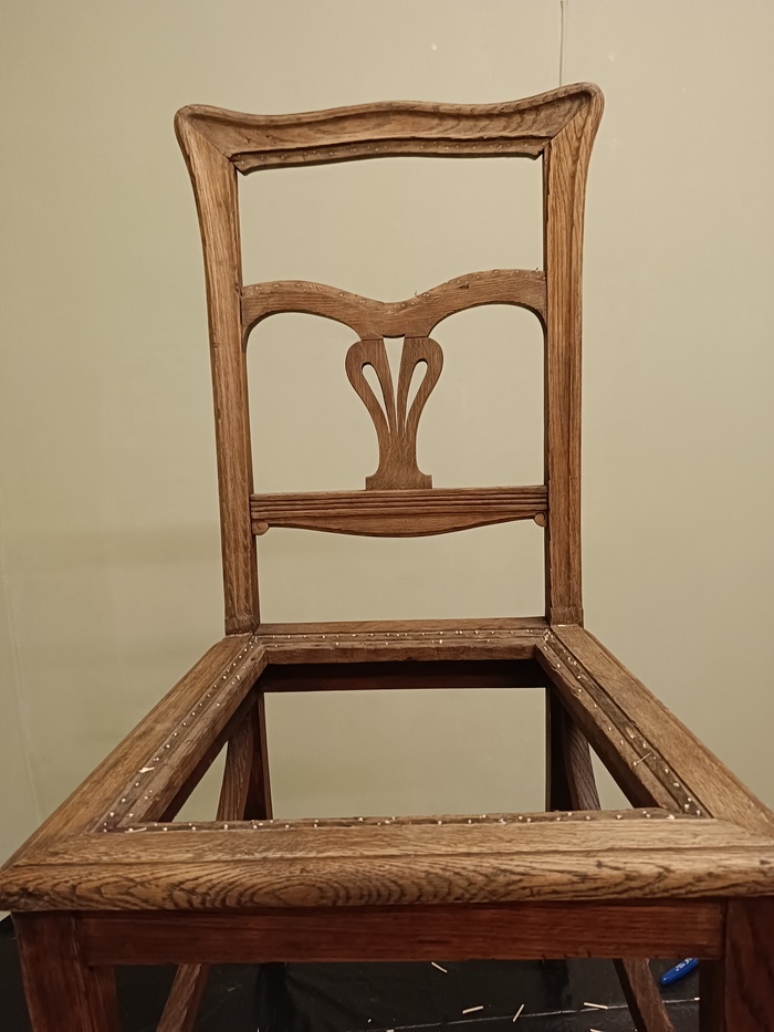 Сейчас у меня в работе вот такой стул эпохи модерн. Надо его очистить от старого покрытия, подклеить, подготовить к обивке и затонировать.
