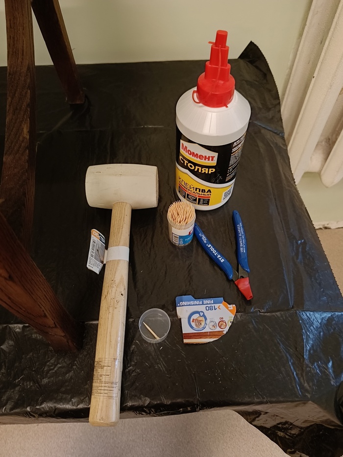 Берëм: стул - 1 шт, клей столярный - 1 банка, зубочистки (в идеале берёзовые, но и бамбуковые тоже подойдут) 1 коробочка, кусачки и подложка, куда клей будем выдавливать и молоток, которым будем забивать зубочистки