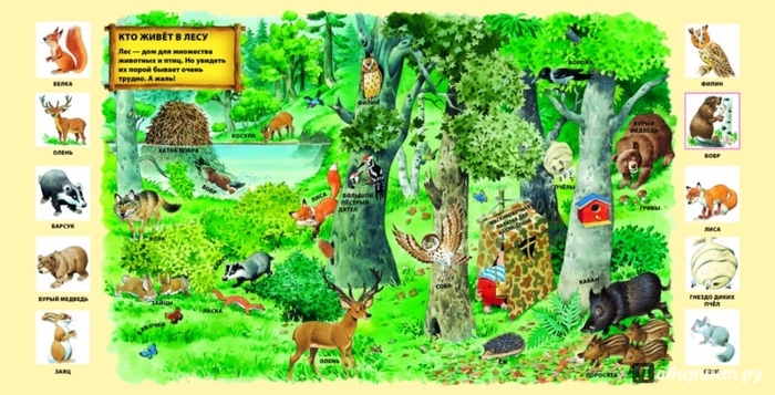 3) "В лесу". Это моя любимая книга))) Особенно нравится разворот "Ночь в лесу", сказочно и волшебно. А однажды к нам пришел в гости мальчик 2,5 лет и оторвал у этой книжки несколько окошек, в основном животных и их части тела и сложил их в грузовик. Маленький живодёр... Мы с сыном потом очень трогательно, бережливо и со всей ответственностью "лечили" зверюшек, клеили, "пришивали" оторванные части бедных животных. А на следующий день делали "утренний обход" наших пациентов, проверяли, всё ли правильно "срослось".