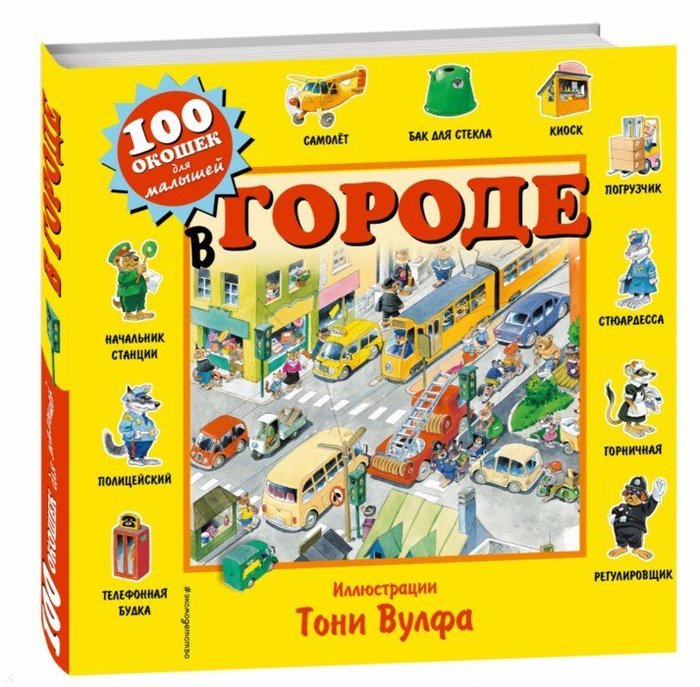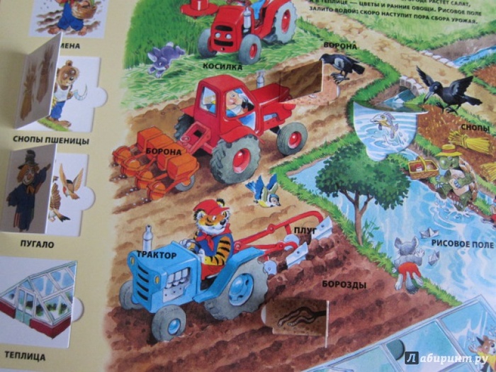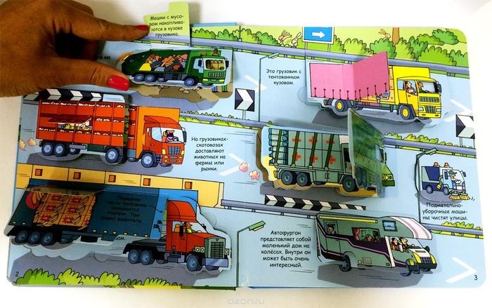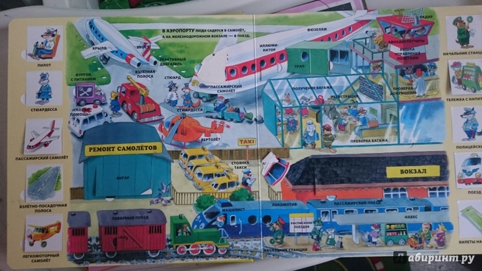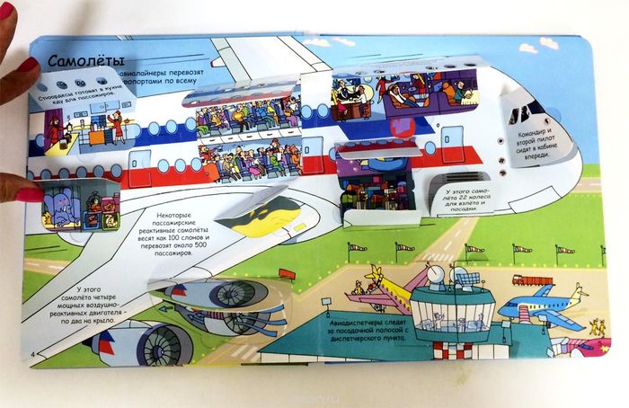 Большие иллюстрации, двойные окошки, т.е. (пример) мусорная машина-открываешь кузов - там мусор-открываешь мусор-там свалка. Ну и соответственно есть буквы, всё в виде подсказок расписано, что-куда-зачем-для-чего. На мой взгляд очень информативная книга. Ребенку нравится, таскает её везде. Очень впечатлился разворотом с самолетов. Теперь учит меня, рассказывает где у самолета кухня, где грузовой отсек, в котором везут слона в Африку, где "шЭф" самолета сидит, где "тубина" самолета, как она работает и вообще как такой ооогромный самолет летает! Настоятельно рекомендую книгу!
