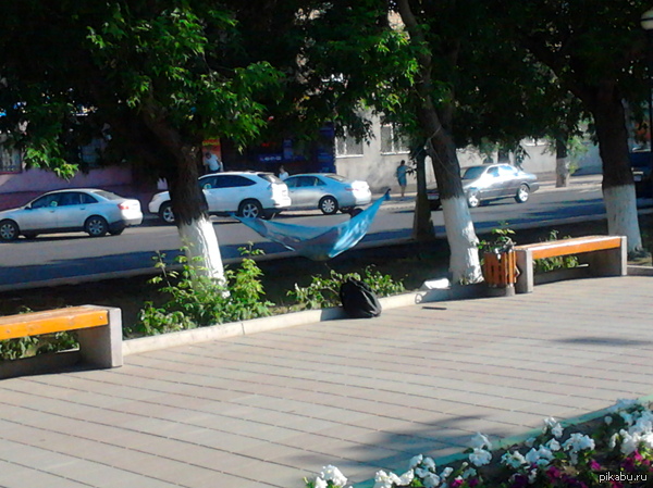 16 Honik городской отдых 11 лет назад центральная улица города. парень просто решил отдохнуть и натянул свой гамак меж деревьев :) [моё] Гамак Жара Отдых