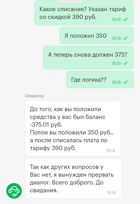Телефонной связью пользуюсь редко, т.к. работаю дома и всё общение происходит в месседжерах. Решил пополнить баланс, который был на тот момент -335 рублей (по словам поддержки -375, но суть не в этом). Пополняю на сумму 350 рублей и в итоге баланс равен -375 рублей.