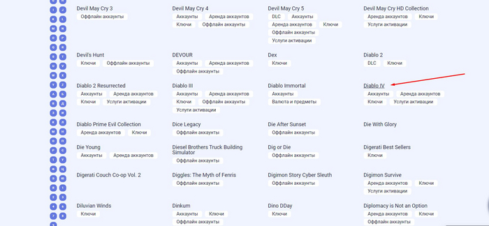 - Заходим в каталог и жмем букву D, а затем находим необходимую нам игру — Diablo 4