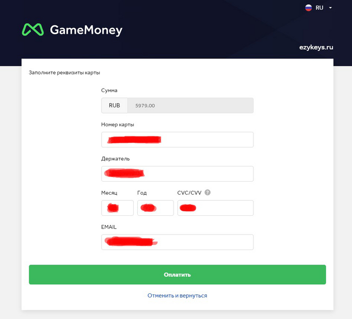 6. Заключительная страница потребует непосредственно ввести данные будь то карты или номер от киви кошелька (в зависимости от того, какой способ оплаты вы вырбали в предыдущем окне)